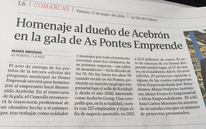La gala del programa de promoción economica “As Pontes Emprende 2016” que tendrá lugar el próximo 27 de mayo en el cine Alovi de As Pontes, contará en su tercera edición con el homenaje a D. Bienvenido Acebron Álvarez, nuestro presidente y fundador, como reconocimiento a toda su trayectoria empresarial por su carácter emprendedor en As Pontes.